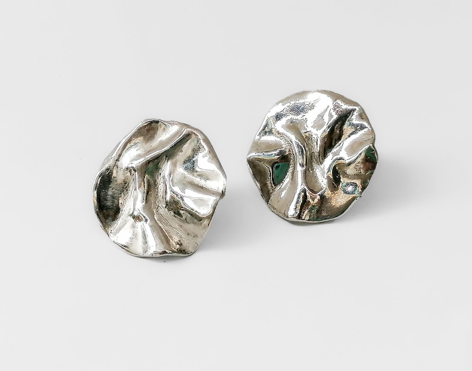 Sterling Silver Melted Disc Stud Earrings – Handmade 925 Textured Minimalist Jewelry for Women Add a touch of modern elegance to your style with these handcrafted sterling silver melted disc stud earrings. Designed with an organic, irregular shape, each earring captures the beauty of imperfection and the fluidity of molten metal. Made from high-quality 925 sterling silver, these lightweight studs feature a unique, textured finish that reflects light beautifully. Their minimalist yet bold aesthetic makes them perfect for both everyday wear and special occasions. Material: 925 sterling silver (nickel-free, hypoallergenic) Size: Approx. 2.5 cm diameter Finish: High-polish with melted texture or matte Backing: Secure butterfly clutch backs These artisan earrings are a thoughtful gift for birthdays, anniversaries, or simply a statement piece to elevate your jewelry collection. Perfect for: Minimalist fashion, modern art lovers, unique gift ideas, bold everyday accessories.